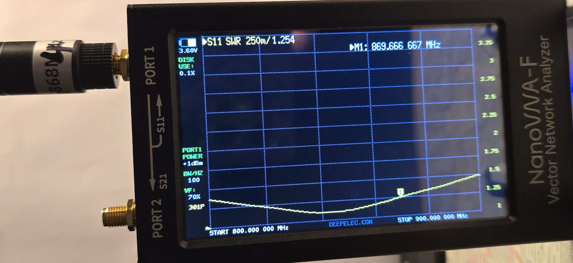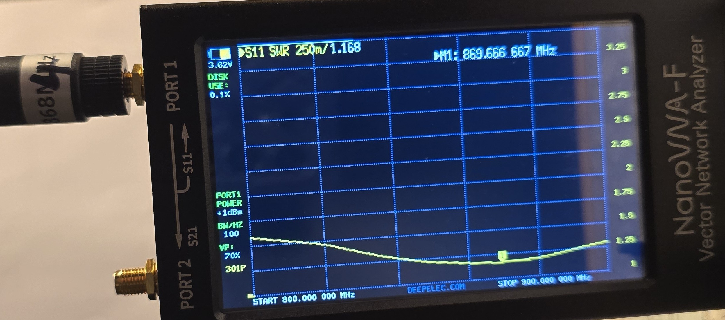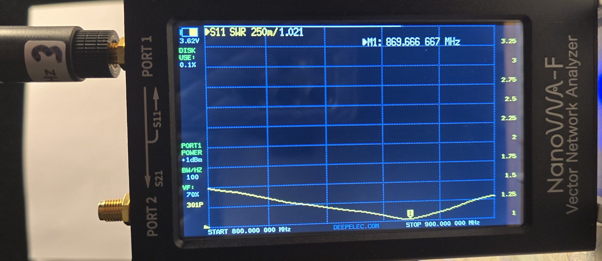 Angeregt durch Antennenmessungen (rf vector impedance analyzer n1201sa) habe ich vier Antennen 868 MHz an meinem NanoVNA-F bzgl. SWR ausgemessen. Zu Beginn habe ich den VNA kalibriert ( open, short, 50 Ohm ). Zwecks Vergleich habe ich den Marker auf 869.6 MHz gesetzt im Kontext mit der Betriebsfrequenz von MeshCore.