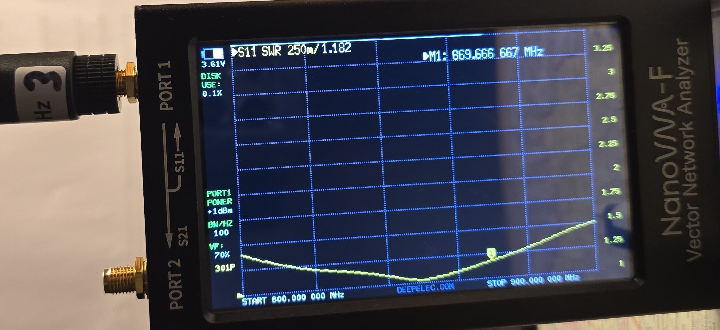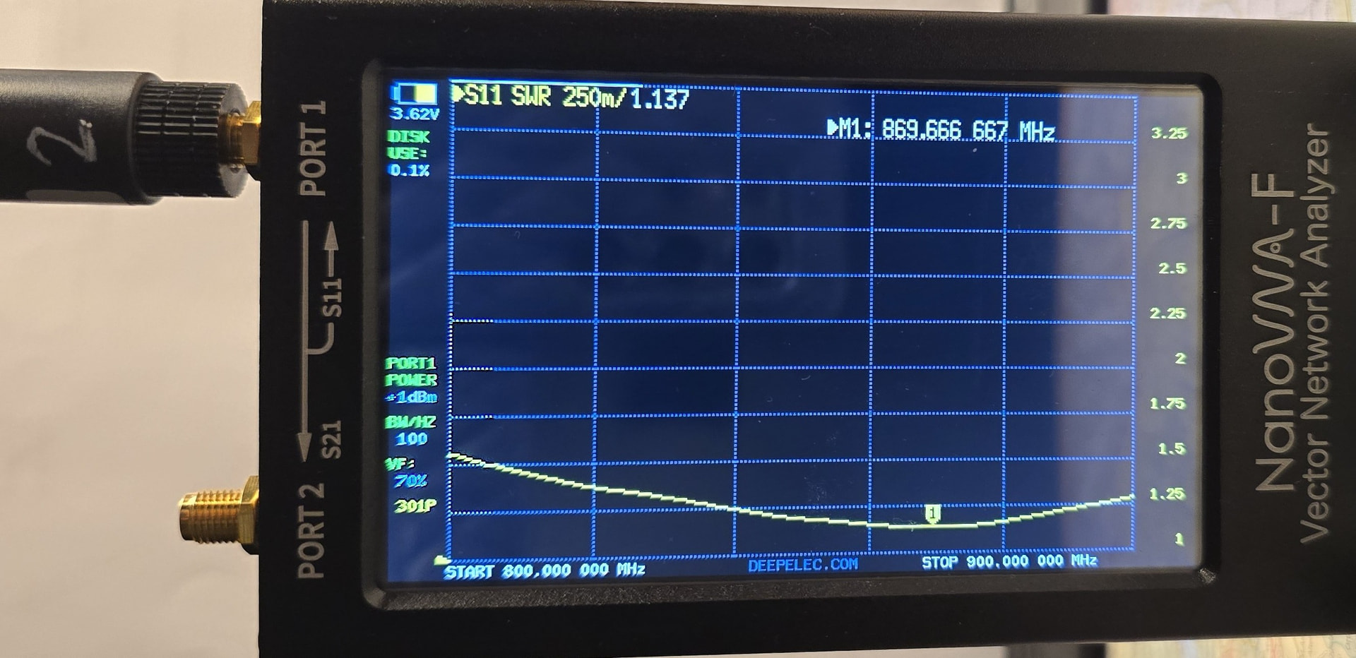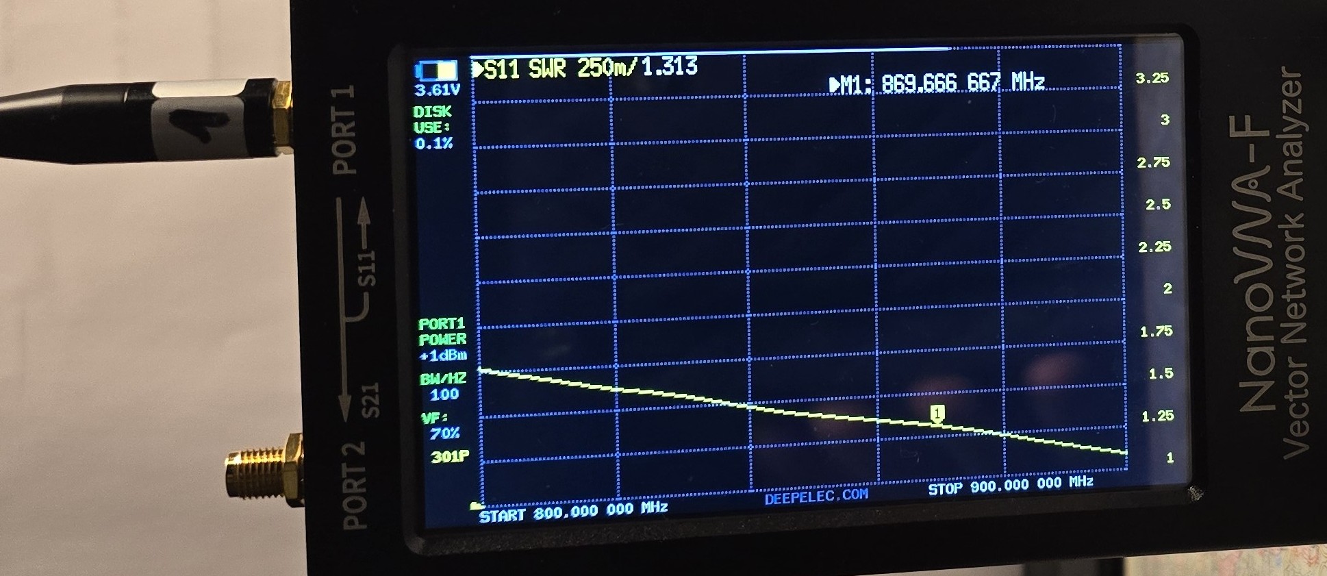 Angeregt durch Antennenmessungen (rf vector impedance analyzer n1201sa) habe ich vier Antennen 868 MHz an meinem NanoVNA-F bzgl. SWR ausgemessen. Zu Beginn habe ich den VNA kalibriert ( open, short, 50 Ohm ). Zwecks Vergleich habe ich den Marker auf 869.6 MHz gesetzt im Kontext mit der Betriebsfrequenz von MeshCore.
