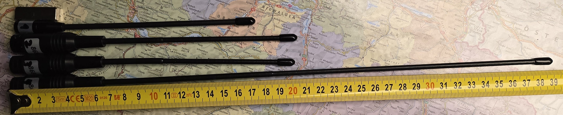 Auch wenn ein gutes SWR gegen 1 noch keine gute Antenne ausmacht ( siehe Vergleich mit der Dummy-Load von @HB9DTZ Welche Antenne für den D5 Solar Repeater? ), habe ich die vier Antennen “optimiert”, vielleicht auch ruiniert, das wird die Anwendung zeigen und ist nicht im Rahmen dieser Messungen. Die Antennen wurden rücksichtslos mittels des Mess-Setups gegen ein minimales SWR hin gekürzt. Ausnahme: Antenne 1 war bereits zu kurz, und auf ein Verlängern habe ich verzichtet. Nach dem Abknippsen mit dem Seitenschneider sah das oben dann so aus: