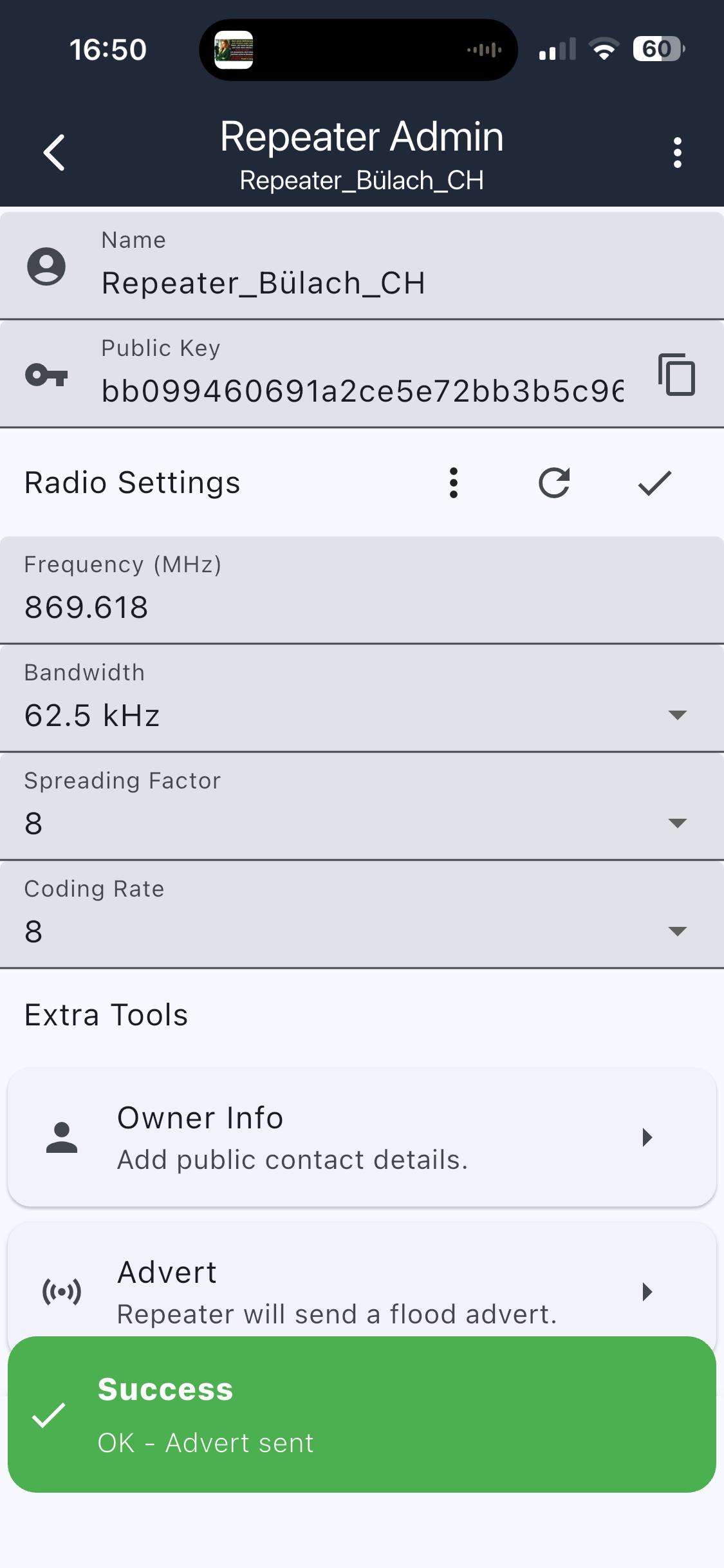 Könntest du mal die Zeit auf dem Repeater prüfen und dann einen Advert machen? Wenn die Zeit nicht stimmt klappt das mit den Adverts nicht, dann schnappt mein Updater die auch nicht auf. Das wäre gerade so die beste Idee ich habe.