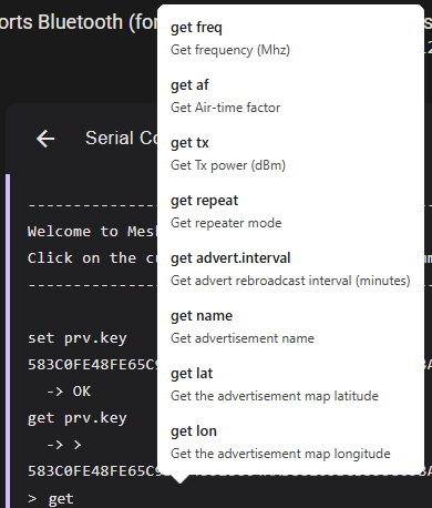 get prv.key und set prv.key sind nur via USB Console zugänglich, nicht vie LORA und ADMIN Console. ich glaube die sind in der CLI Hilfe nicht aufgeführt aber funktionieren, ich verwende die meist bei meinen Repeatern da ich collision des ersten Bytes der Repeater ID vermeiden möchte.