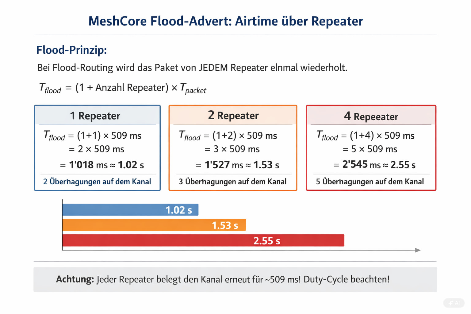 Alltagsvergleich: Stell dir einen Staffellauf vor. Die Originalnachricht ist der Staffelstab. Bei 4 Repeatern muss der Stab 5-mal übergeben werden – und jedes Mal braucht der Läufer seine volle Laufzeit (~509 ms). Erst wenn der letzte Läufer im Ziel ist, ist die Nachricht angekommen.