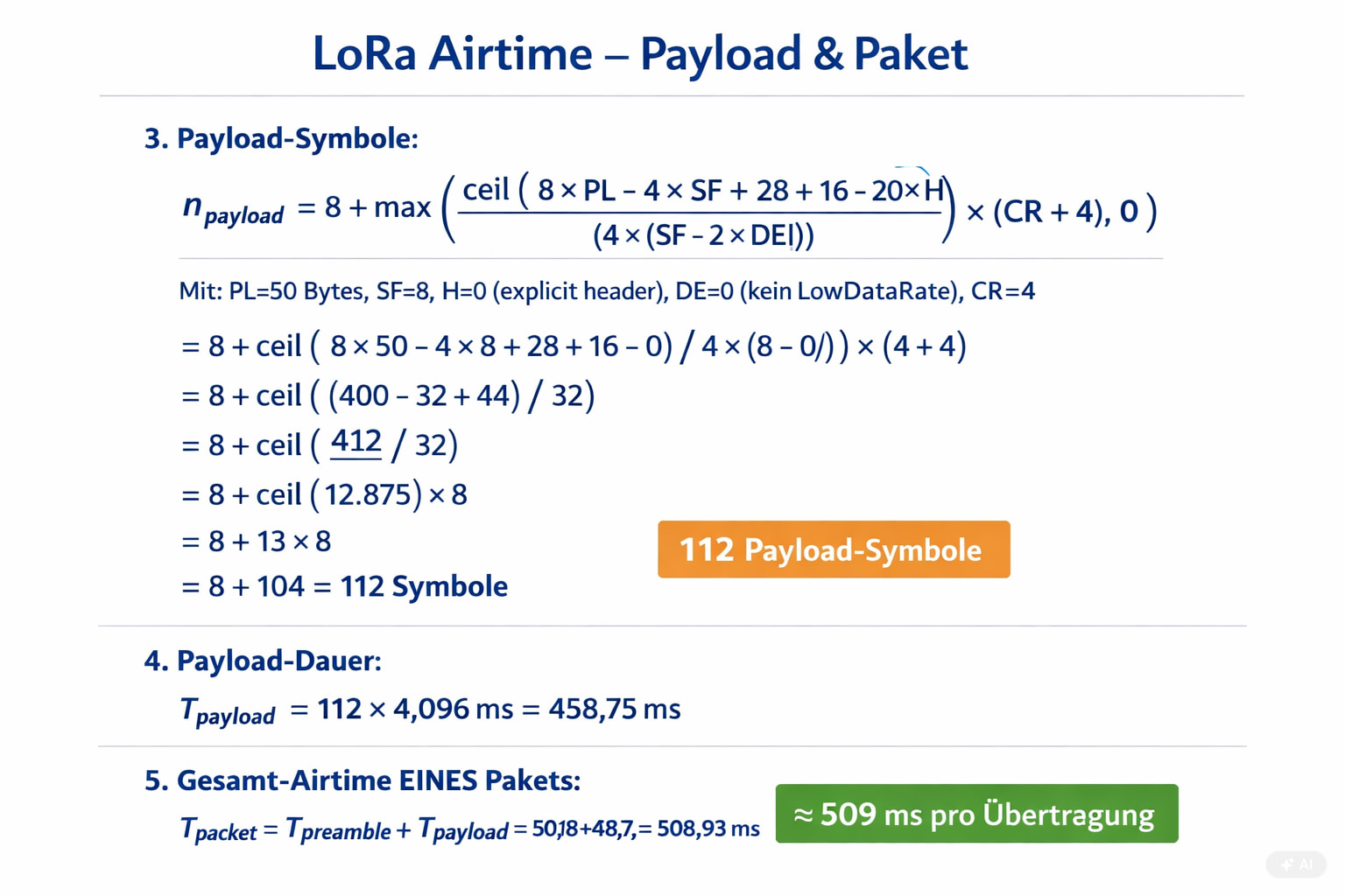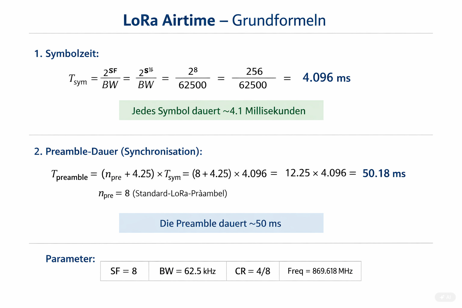| SF (Spreading Factor) | 8 | Wie stark das Signal “gespreizt” wird |