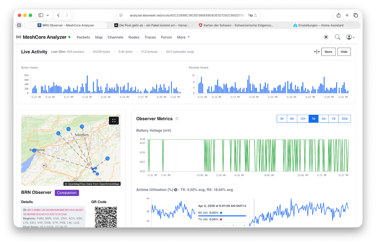 Das ist das ‘Fenster’ zum Mesh. Du erreichst es durch KLICK! oder alle Observer in der Schweiz via https://analyzer.letsmesh.net/status/observers?region=switzerland