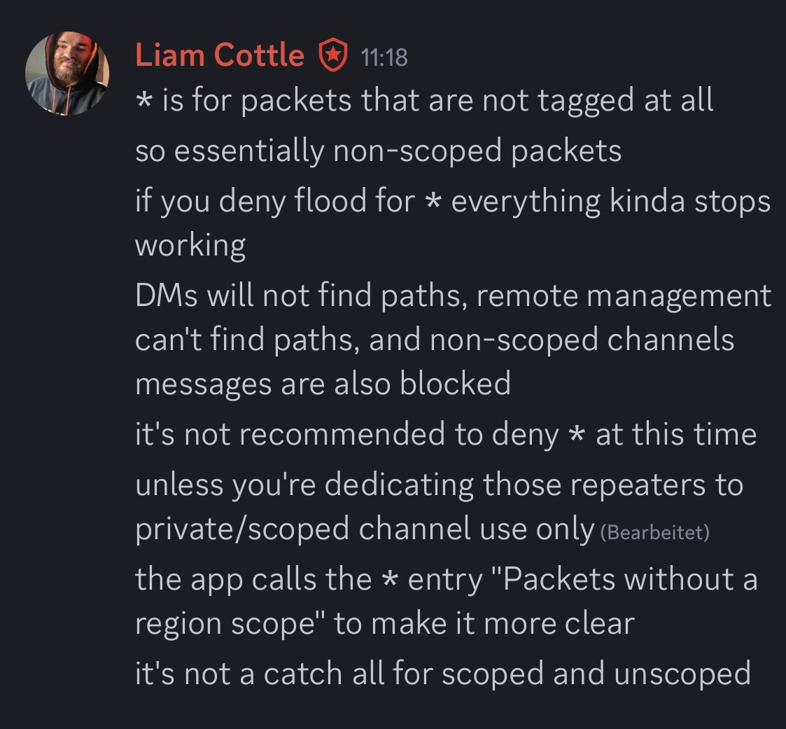 Ich gehe davon aus dass irgendwann im Companion ein “default scope” definiert werden kann um dies auch ohne “* Flood allowed” wieder zu ermöglichen, dies müsste dann jedoch vermutlich nicht nur im Companion sondern auch in den Repeatern definiert werden können. Ich glaube dass für Repeater Admin zuerst beidseitig geflooded wird bevor beide Seiten den Pfad gelernt haben und nicht mehr flooden.