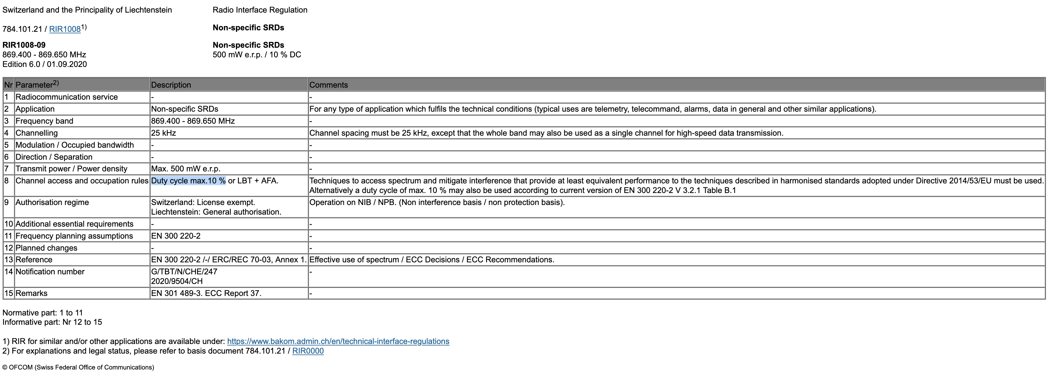 Die Kanalisierung im 25 kHz Raster ist weggefallen und damit auch die Forderung nach einer Bandbreite von unter 25 kHz. So können nun die, für LoRa Transceiver typischen Kanalbandbreiten alle legal genutzt werden. Mit unserer Frequenz 869.618 MHz und 62.5 kHz Bandbreite belegen wir somit das oberste Viertel des, im Rahmen der RIR1008-09 verfügbaren Frequenzbereiches. Somit verbleiben für andere ähnliche Anwendungen drei identische Kanäle unterhalb “unseres” Kanals.