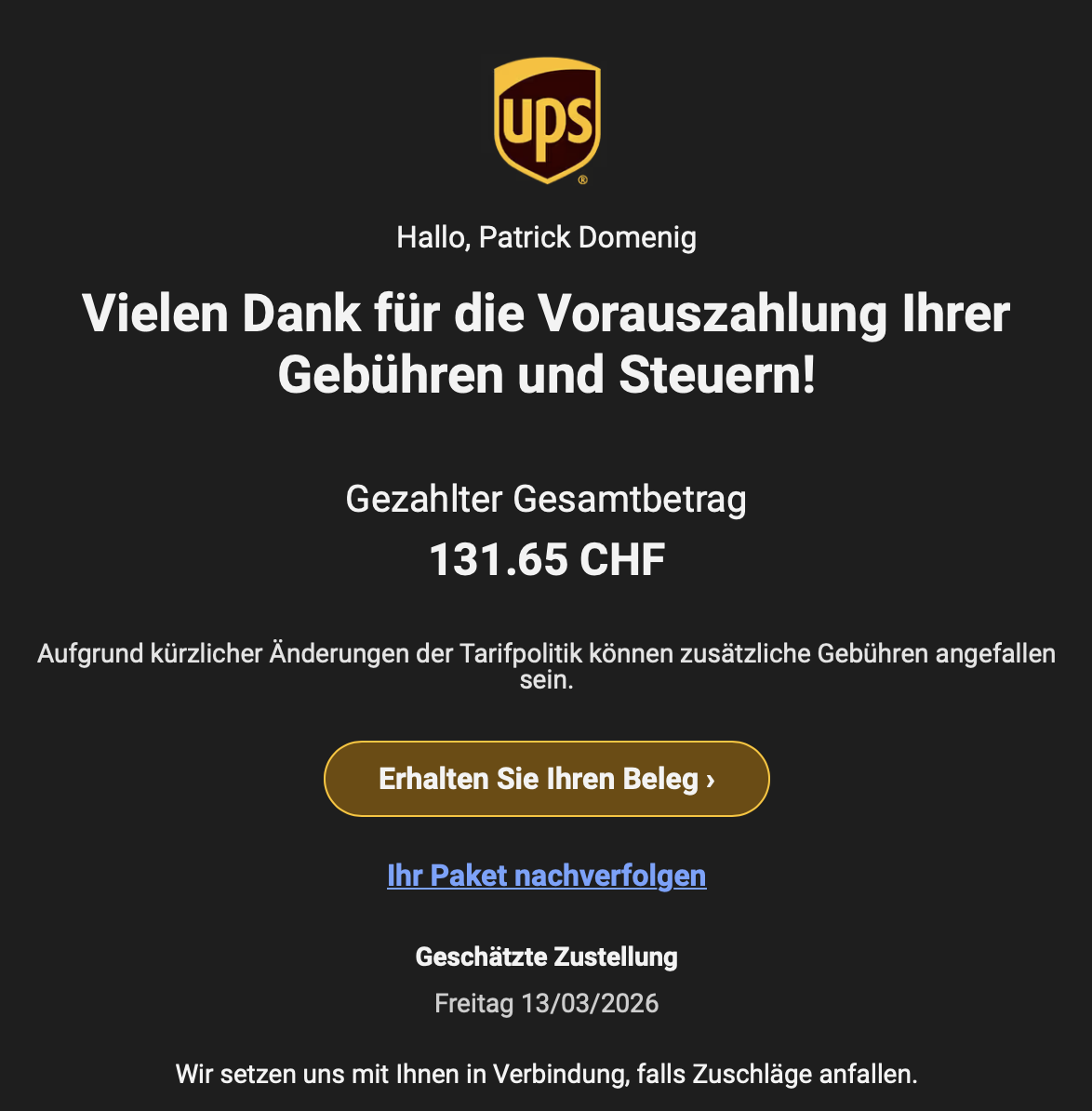 UPS Zollrechnung: sFr 131.65