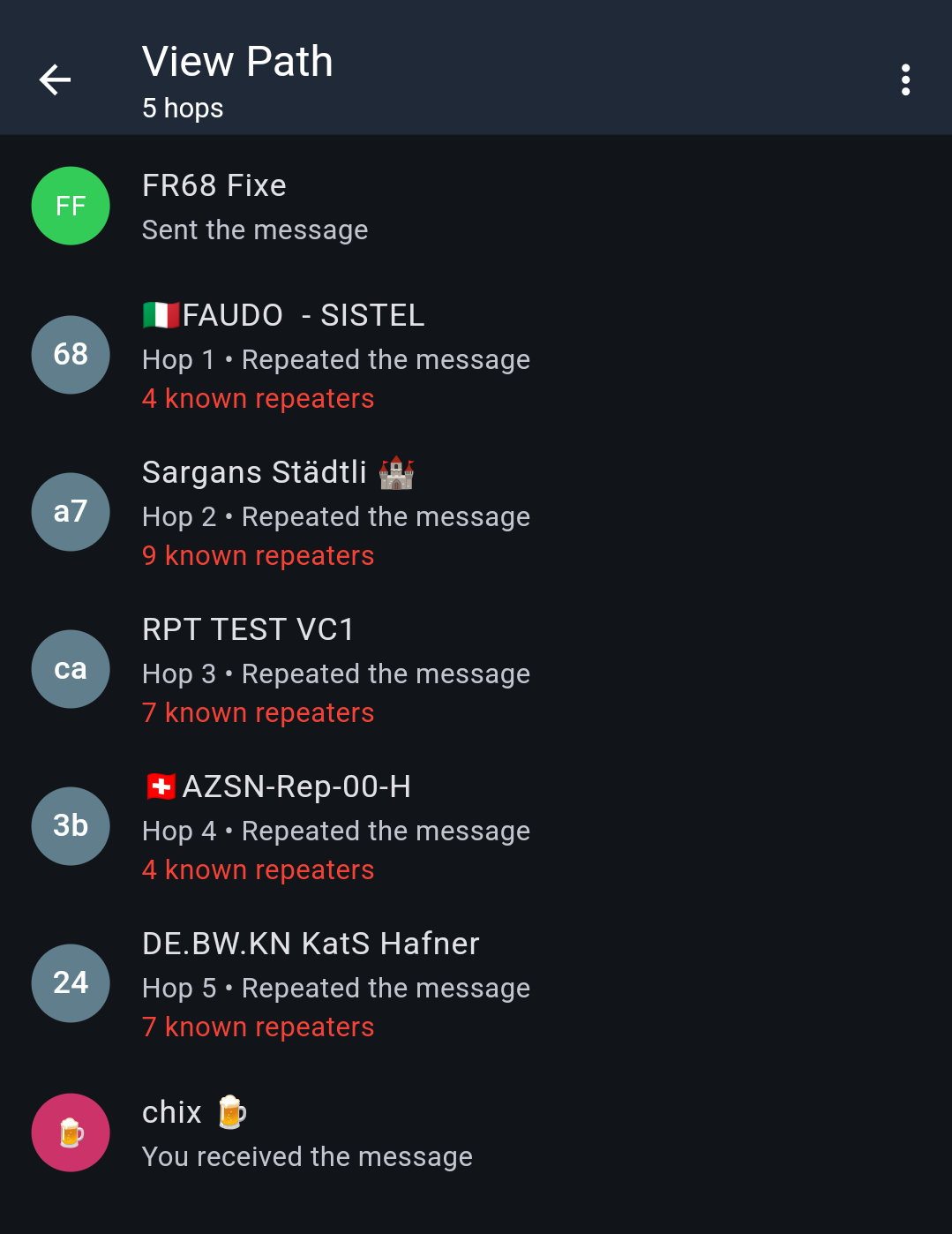 Soweit so gut! Hier sehen wir den Weg der Nachricht ‘ping’, welche von der Station HV abgesetzt wurde. HV sieht nach dem Absetzen der Nachricht, dass diese von einem oder mehreren Repeatern empfangen und verteilt worden ist. Was HV auf seinem Companion nicht sieht, ist der wirkliche Weg seiner Nachricht und 12 der Repeater (einige mehrfach), welche die Nachricht empfangen und weitergeleitet haben.