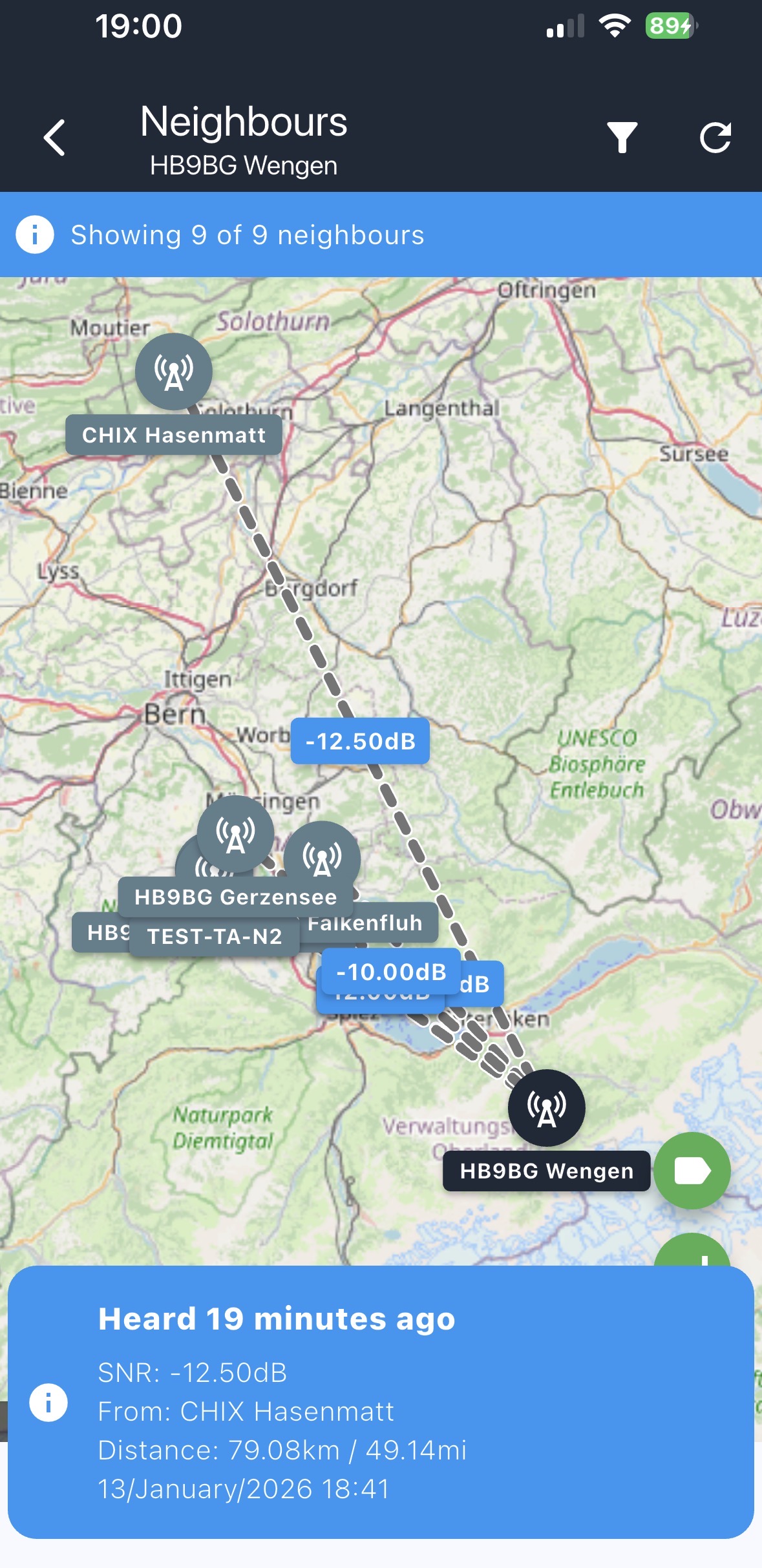 Und der CHIX Magglingen ist auch sichtbar von hier. Beide wohl über eine Reflektion. Das ist aber in diesem Frequenzbereich oft so und hilft uns „um die Ecken“ zu schauen.